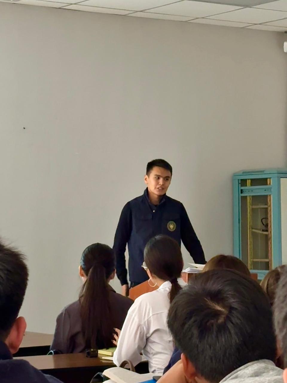 С лекцией выступил старший лейтенант полиции Токтарбеков Рустам Бейсенгалиевич, оперуполномоченный Управления по противодействию киберпреступности Департамента полиции города Алматы.