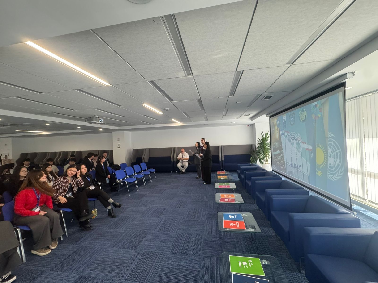 A highlight of the event was the presentation "The Role of Youth in the Development of the UN and the Implementation of the 17 SDGs," delivered by three participants: Kurmangali Bakdaulet (Kazakh), Seisebayev Kamil (Russian), and Kapenova Dariya (English).