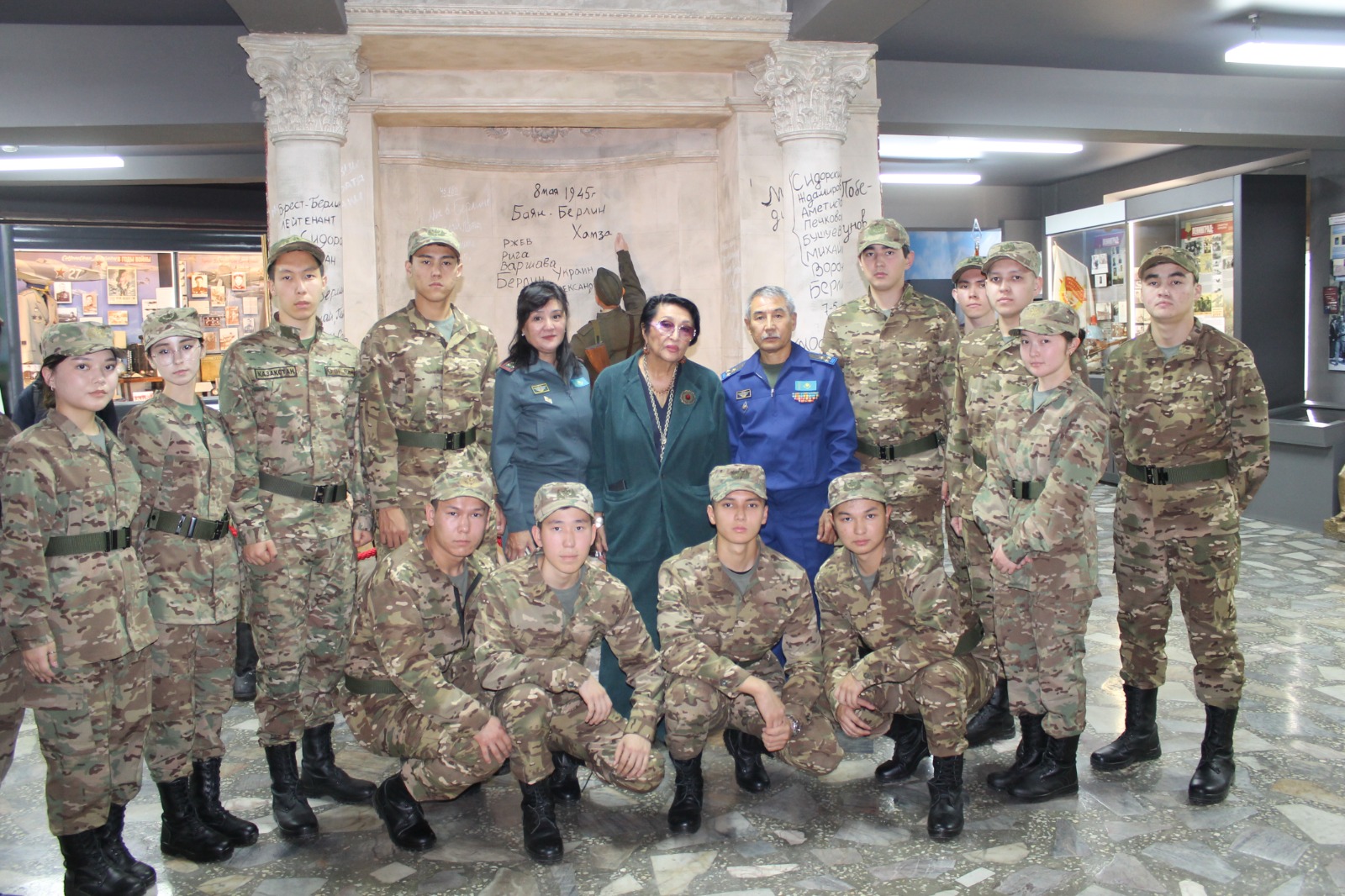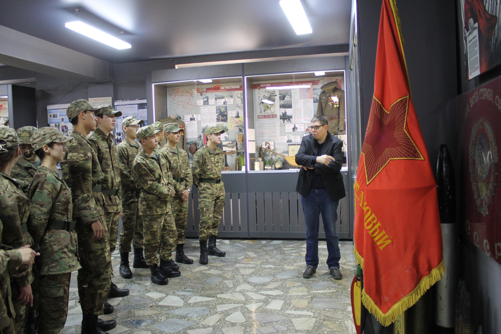 Сабақ алдында музей қызметкерлері студенттерге жаңартылған залдар мен әскери техника көрмесін таныстырып, мазмұнды экскурсия өткізді. Болашақ офицерлер көрмелерді қызығушылықпен тамашалап, ел тарихының жаңа беттерін және халықтың жауынгерлік дәстүрлерін таныды. Студенттер Ұлы Отан соғысы кезеңіндегі қару-жарақ үлгілерімен, әскери жабдықтармен және марапаттармен танысты.