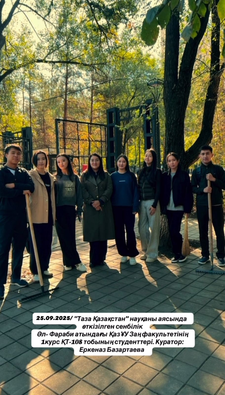 On September 25, 2025, students of Group ҚТ-108, 1st year, Faculty of Law of Al-Farabi Kazakh National University, together with their curator Erkenaz Bazartaevna, took part in the national ecological campaign “Taza Kazakhstan”, organizing a cleanup event on campus. 🌿