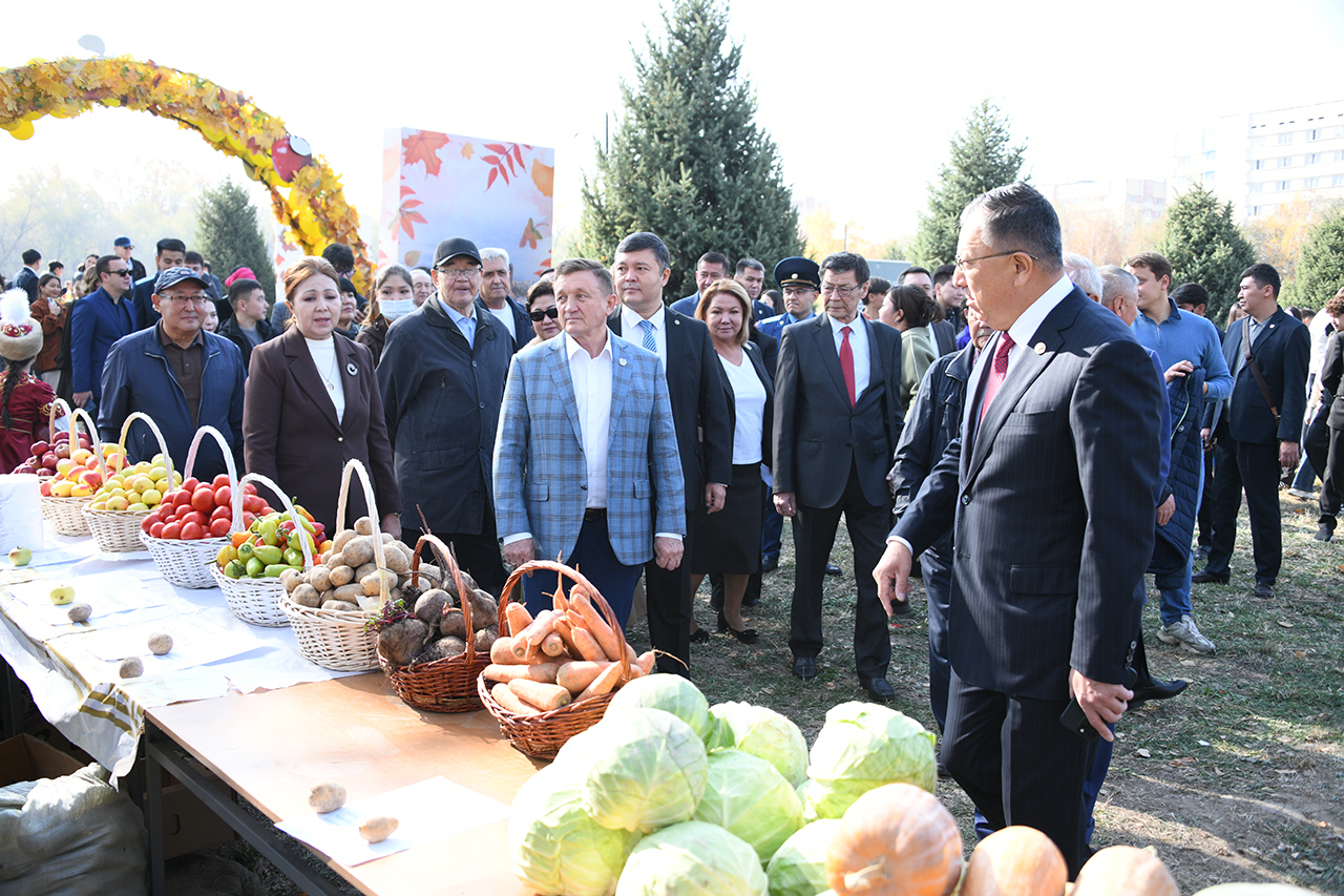 Жәрмеңке сөрелерінде картоп, сәбіз, қырыққабат, асқабақ, қызанақ, болгар бұрышы, баклажан және хош иісті алмалар ұсынылды.