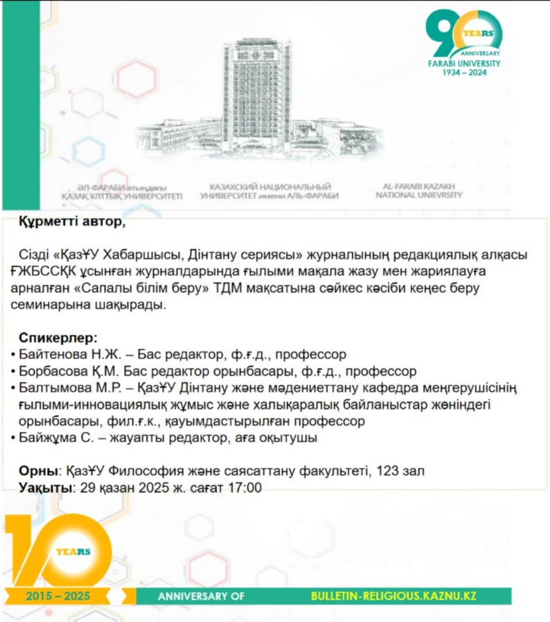 2025 жылы 29 қазанда Философия және саясаттану факультетінде Дінтану және мәдениеттану кафедрасының ұйымдастыруымен ТДМ: «Сапалы білім беру» мақсатына сәйкес ҒЖБССҚК ұсынған журналдарда мақала жазу мен жариялау тақырыбында кәсіби кеңес беру семинары өтті.