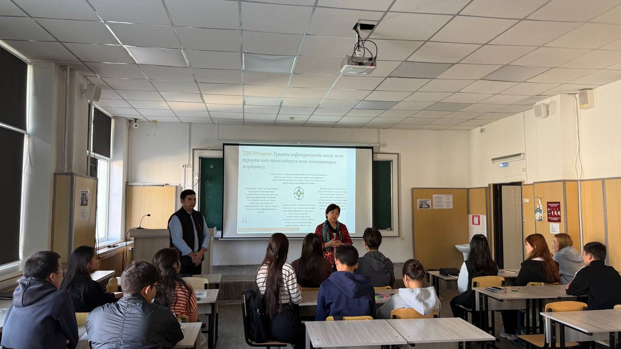 Магистрант студенттерді белсенді әрекетке тарту мақсатында топтық жұмыс ұйымдастырып, «Сіздің қалаңыздың тұрақты дамуына көмектесетін қандай инновация ойлап табар едіңіз?» деген сұрақ арқылы шығармашылық ойлау, талдау және шешім қабылдау дағдыларын дамытуға бағытталған тапсырма берді. Сабақ барысында студенттер кәсіби бағыттағы ойларын бөлісіп, болашақ математикалық модельдеуші маман ретінде тұрақты даму элементтеріне қатысты өз ұсыныстарын ұсынды.