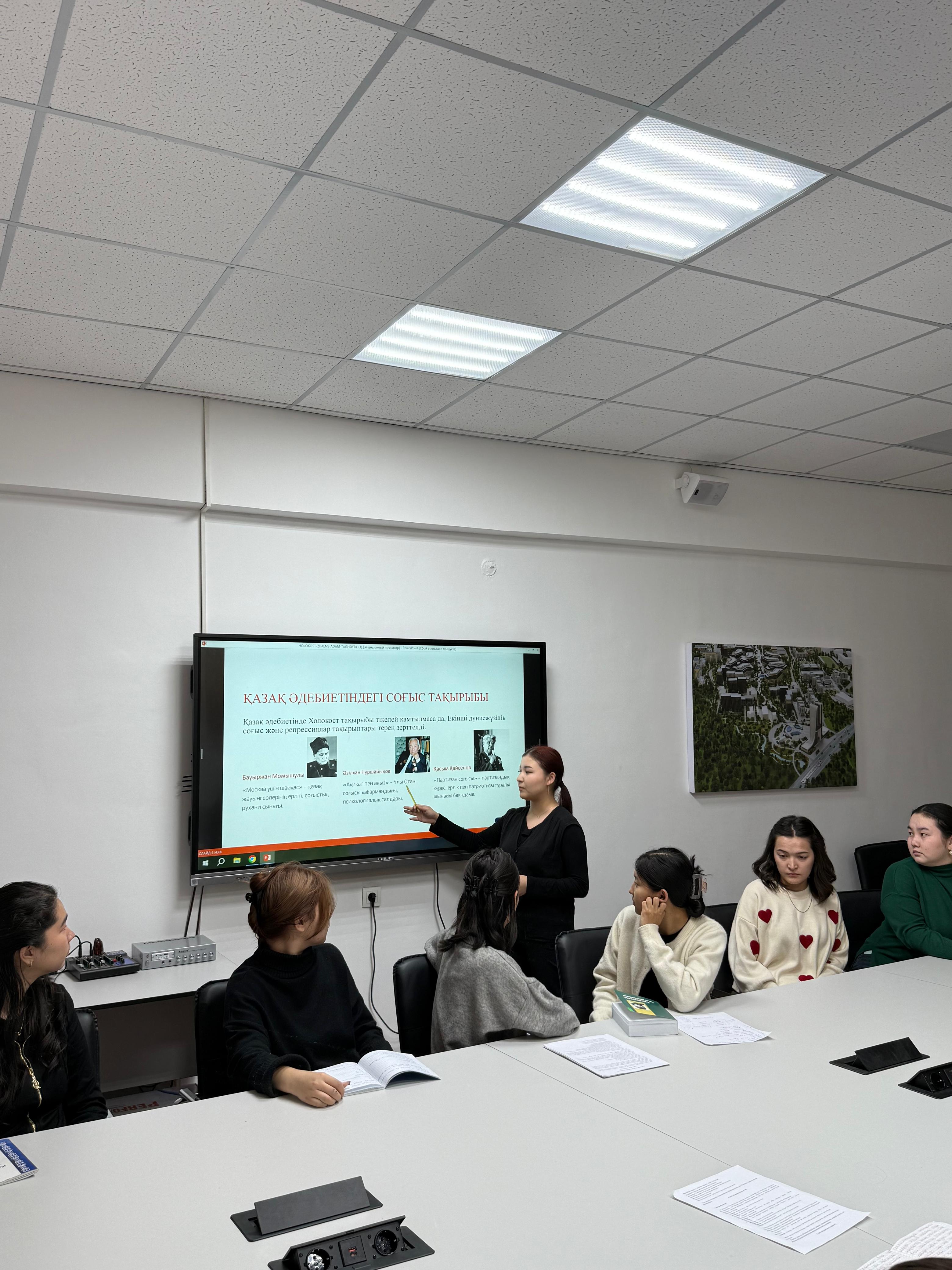 The students explored various ways the Holocaust tragedy is portrayed in literature, discussing the themes of human destiny, war, and suffering through the works of E. M. Remarque, J. Heller, K. Vonnegut, and other world writers. They also compared how the theme of war is depicted in world and Kazakh literature, addressing issues of human fate, pain and hope, and spiritual resilience. Special attention was paid to the ideological perspectives and artistic techniques of authors who depicted the Holocaust tragedy.