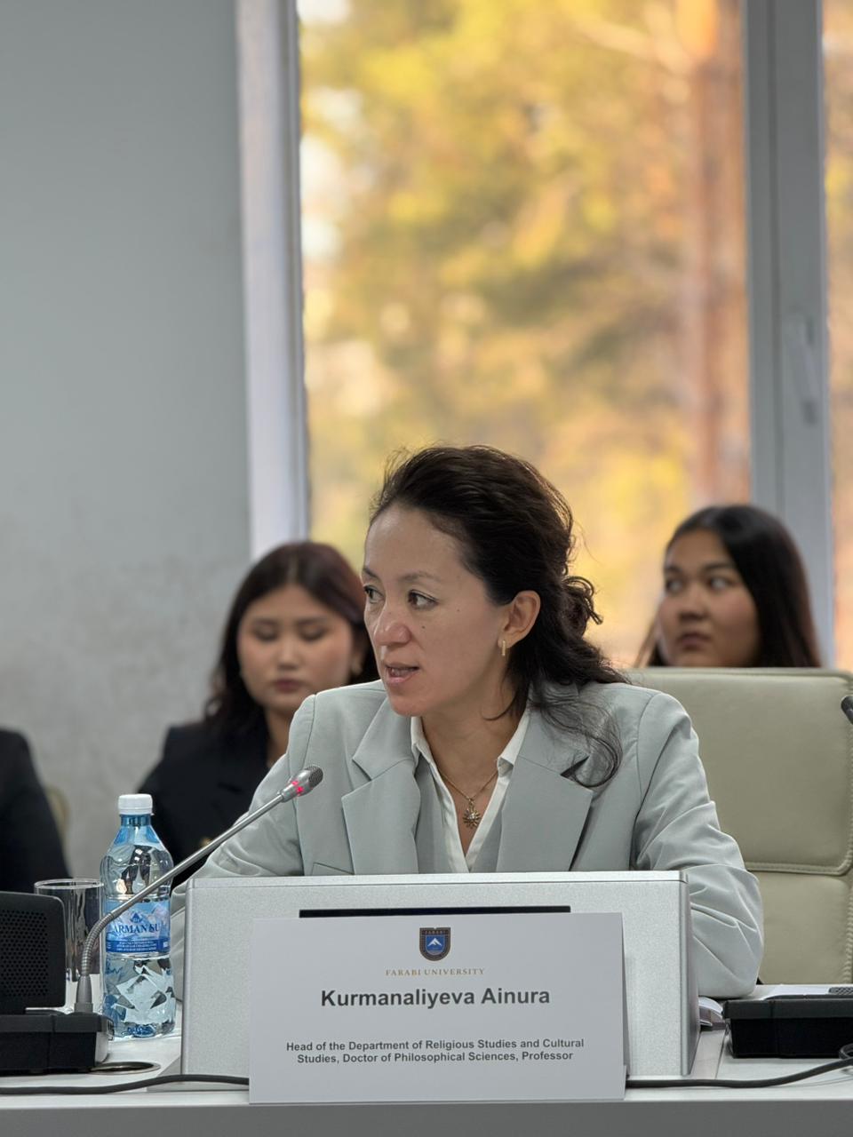 Философия және саясаттану факультетінің Дінтану және мәдениеттану кафедрасының меңгерушісі Айнұр Құрманалиева араб тілін исламтану зерттеулерінде қолданудың өзектілігін атап өтіп, ҚазҰУ-да ИСЕСКО-ның зерттеу орталығын ашу жөнінде ұсыныс білдірді.