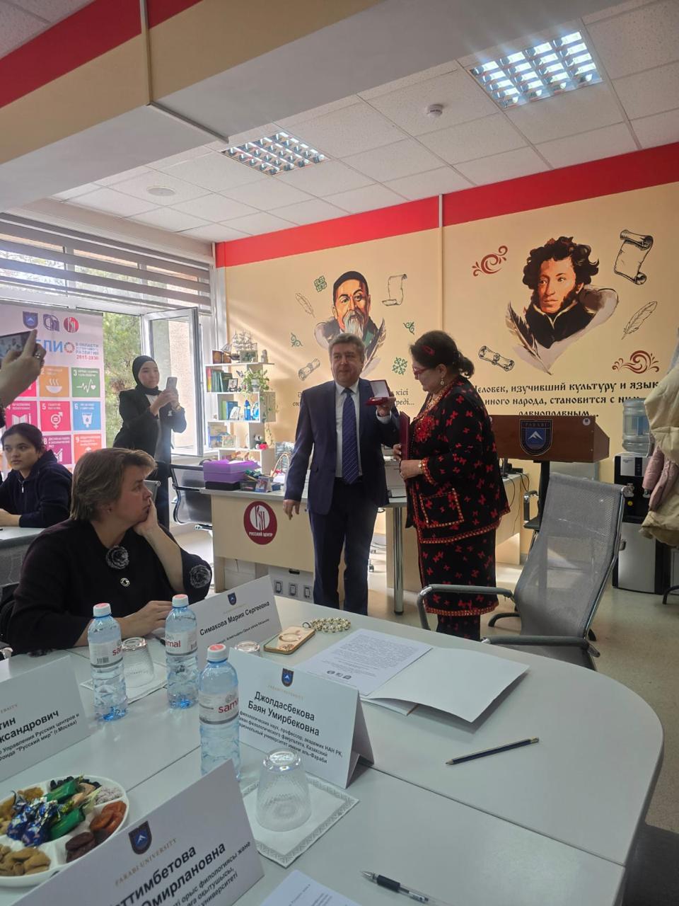 The event was attended by: Sergey Alexandrovich Ulitin, Chief Project Manager of the Department of Russian Centers and Events of the “Russian World” Foundation; Maria Sergeyevna Simakova, Vice-Consul and Head of the Russian House in Almaty; representatives of the Faculty of Philology of Al-Farabi KazNU, the M. Auezov Institute of Literature and Art, Renaissance University of Education (Tashkent, Uzbekistan), and M.Kh.Dulati Taraz University.