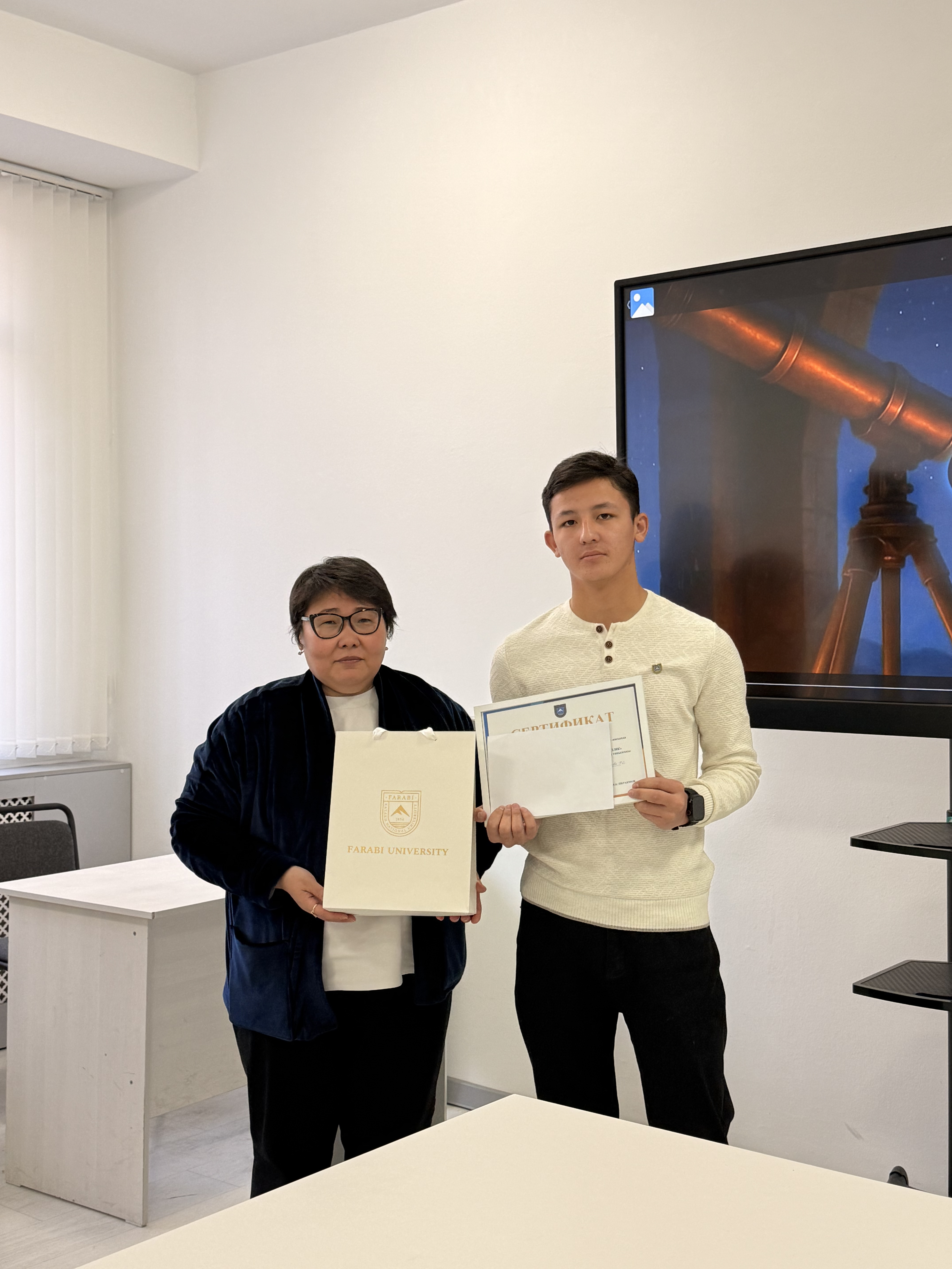 First-year student of the educational program “6B07304 – Cadastre,” Magzhan Baglanuly Serik, took 3rd place with his essay “Farabi’s Wisdom and the Technologies of the Future.” First-year doctoral student of the program “8D07302 – Geoinformatics,” Zhanarys Bakytzhanuly Turymtaev, won 2nd place with his video project “The Image and Word of Al-Farabi Created Using Artificial Intelligence.”