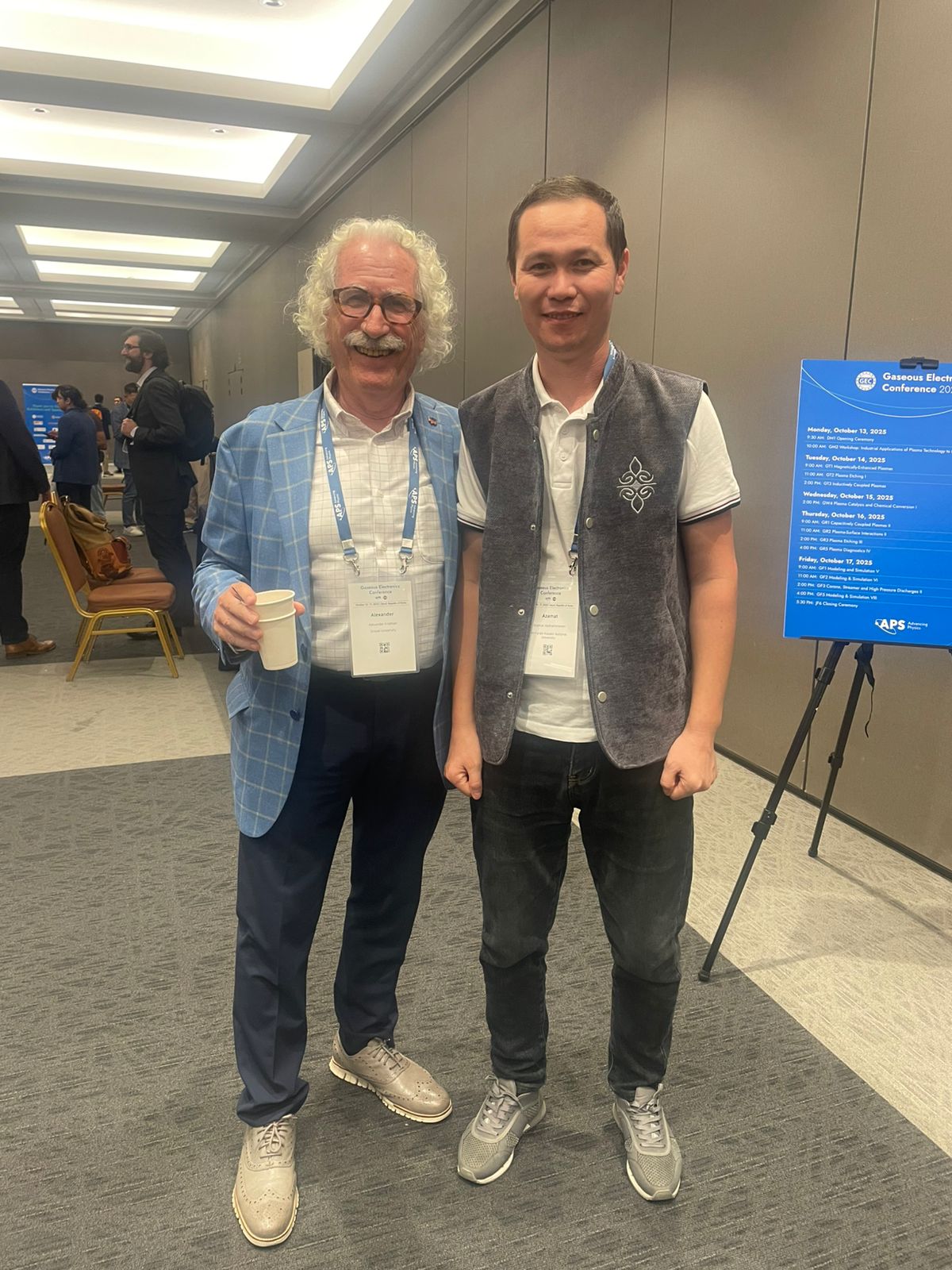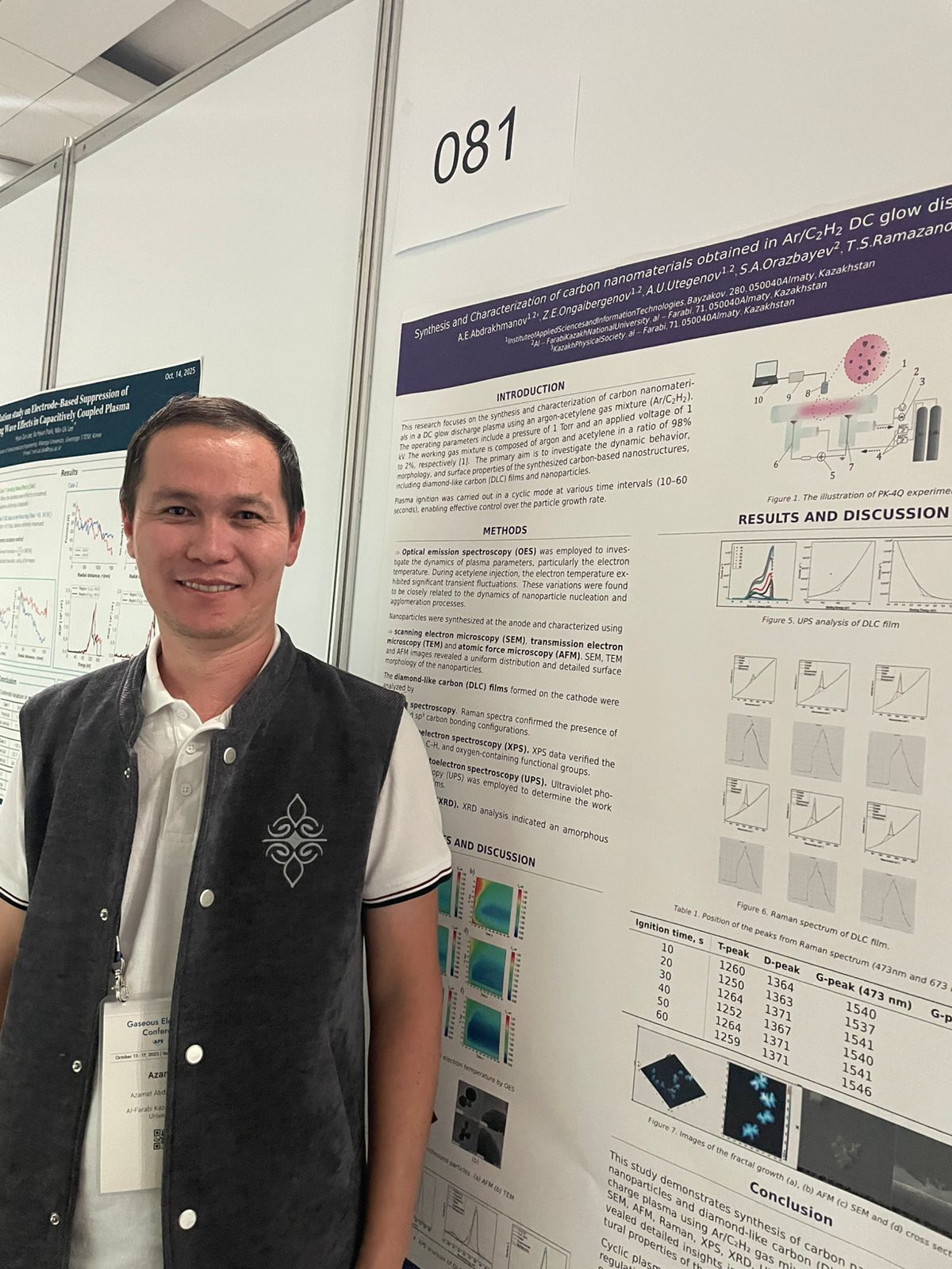 Докторант 3 курса образовательной программы «8D07112 – Наноматериалы и нанотехнологии» Абдрахманов Азамат Еркинулы принял участие в международной конференции Gaseous Electronics Conference (GEC) (Сеул, Республика Корея) в 2025 году. Основная цель конференции – обмен опытом с ведущими мировыми учёными, ознакомление с новыми научными достижениями, рассмотрение возможностей совместных исследований и развитие международного научного сотрудничества. Абдрахманов А. представил результаты своих исследований, установил профессиональные контакты с международным научным сообществом и принял участие в научных дискуссиях.