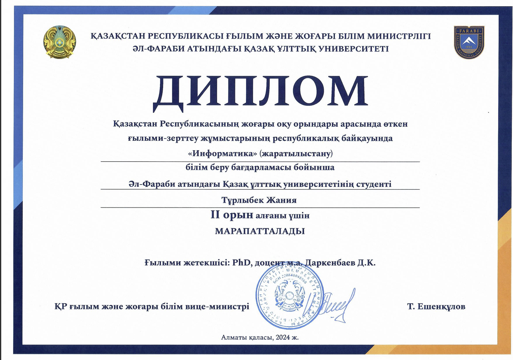 2024 жылы өткен Республикалық студенттердің ғылыми-зерттеу жұмыстары байқауында Есептеу ғылымдары және статистика мамандығының 3 курс студенті Тұрлыбек Жания үздік нәтиже көрсетіп, II орынды иеленді. Ғылыми жетекшісі: PhD, Есептеу ғылымдары және статистика кафедрасының доцент м.а. Даркенбаев Д.К.