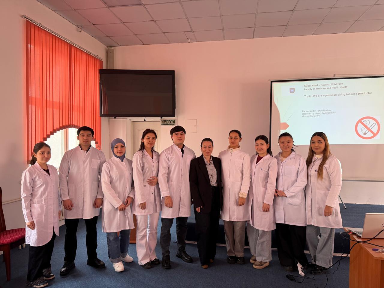 Ішкі медицина кафедрасының аға оқытушысы Ибраева Асем Сериккановна кураторлық ЖМ 23-04 тобымен «Біз темекі өнімдерін шегуге қарсымыз» тақырыбында лекция-семинар өткізді.