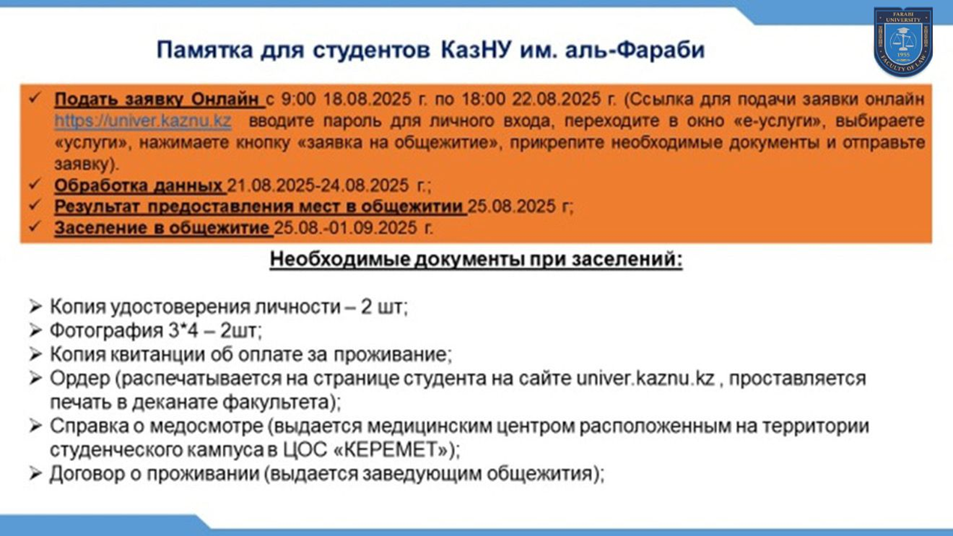 Контролирует размещение иностранных граждан, принятых на обучение в КазНУ по межгосударственным соглашениям (контрактам) за счёт бюджета, в студенческих домах студгородка на общих основаниях с обучающимися из Казахстана.